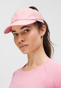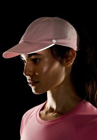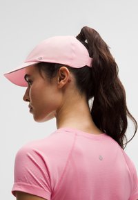 Fiatal nő, aki rózsaszín napellenzőt és hozzáillő rózsaszín sportpólót visel, haja visszafogva, kissé oldalra néz.