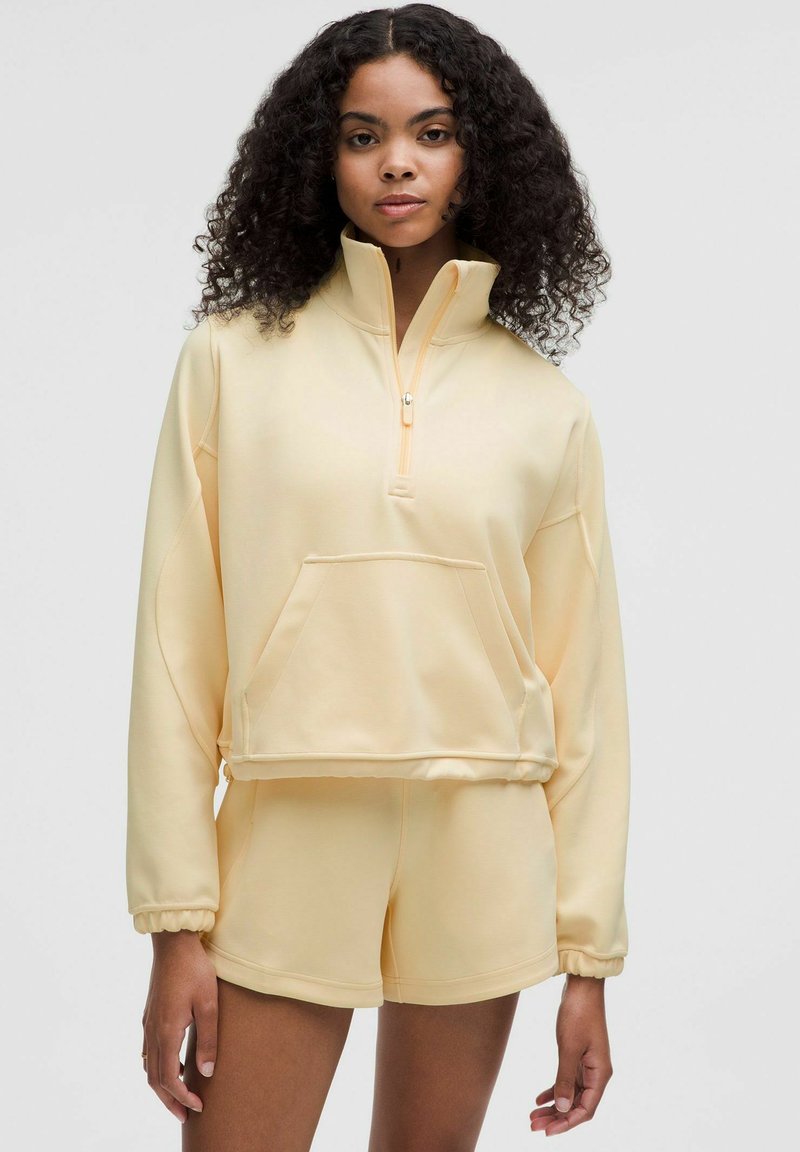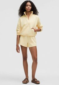 Sárga, rövidített pulóver magas gallérral, elülső zsebbel és cipzáras részlettel; hozzá illő rövidnadrággal, puha, rugalmas anyagból készült.