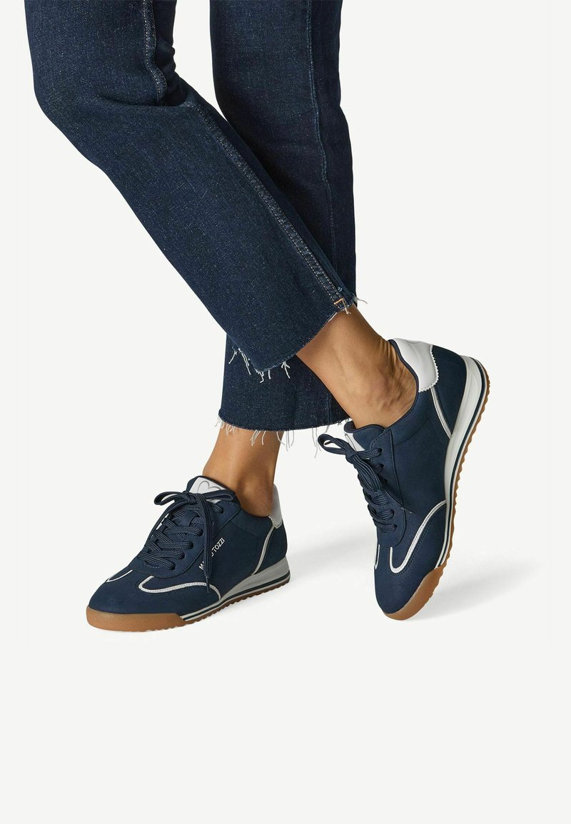 Kék velúr sportcipő fehér részletekkel, gumitalppal és fűzős kialakítással. Elasztikus farmernadrággal párosítva.