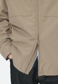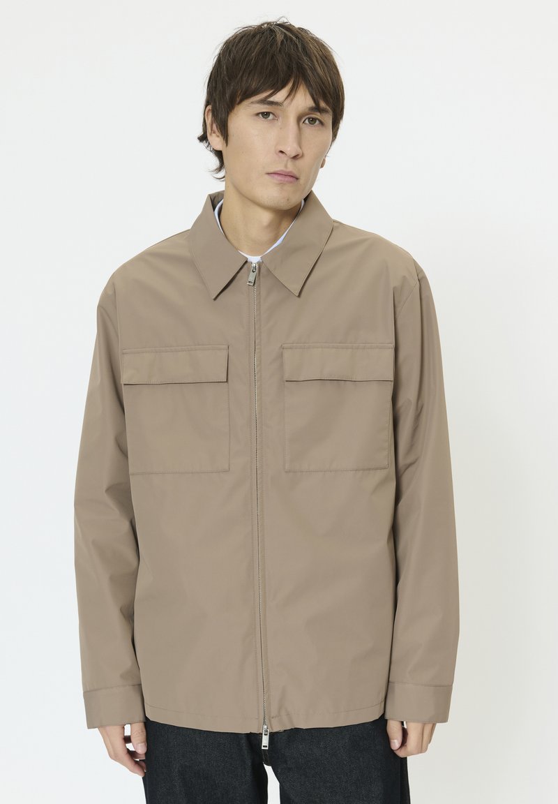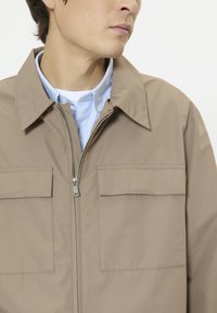 Barna, könnyű dzseki elöl cipzárral, két mellzsebbel és galléros nyakkivágással. Sima textúrájú, hosszú ujjú, laza szabású kialakítás.