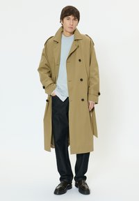 Bézs dupla soros ballonkabát fekete gombokkal, vállpántokkal és térdig érő szabással. Világoskék pulóver fölött viselve.