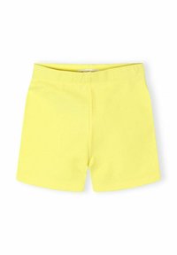 Öt pár egyszínű pamut rövidnadrág sárga, menta zöld, korall, világosszürke és rózsaszín színekben, egymásra helyezve fehér háttéren.