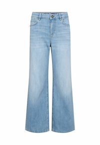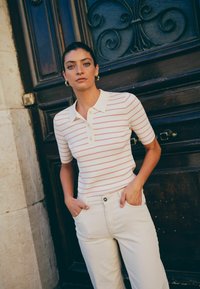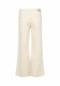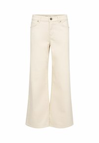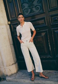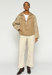 Nő áll, bézs és világosbarna gombos dzsekit, fehér nadrágot, fehér inget és sötétbarna bokacsizmát visel, egyszerű háttér előtt.