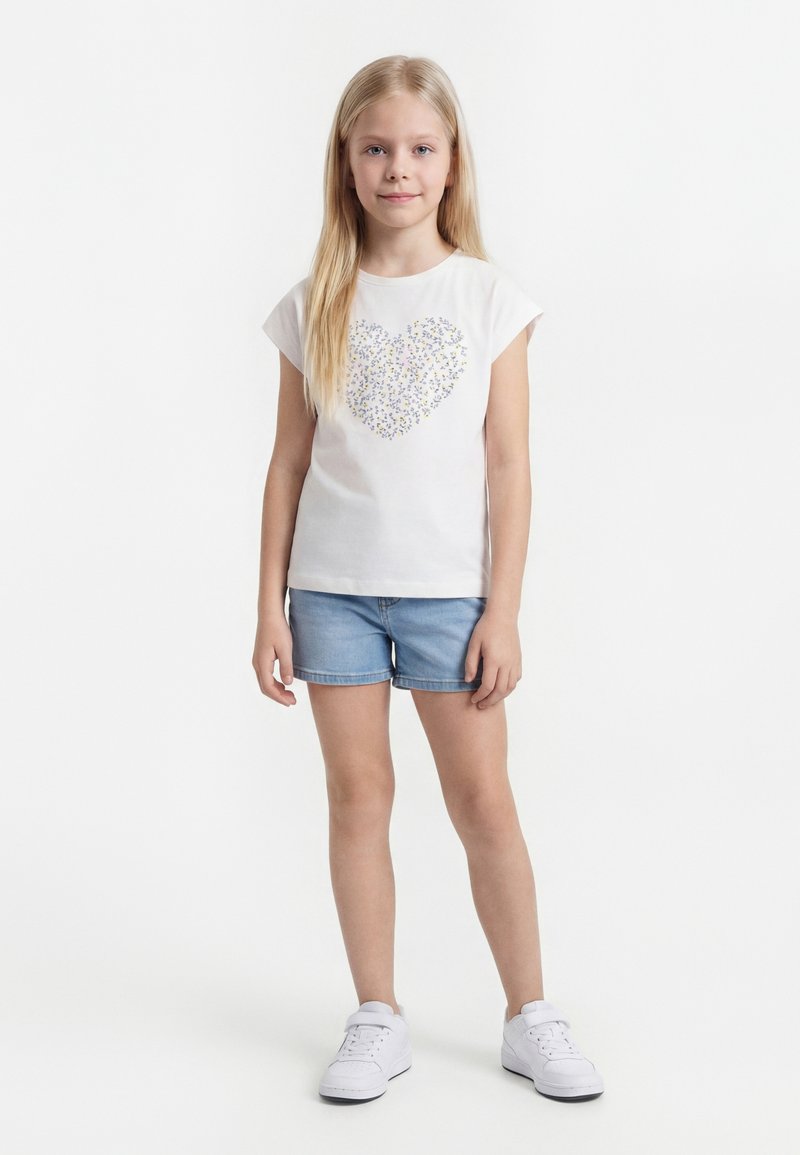 Fiatal lány, hosszú szőke hajjal, fehér pólót visel virágos szív mintával, farmer rövidnadrágot és fehér tornacipőt, fehér háttér előtt áll.