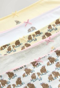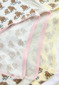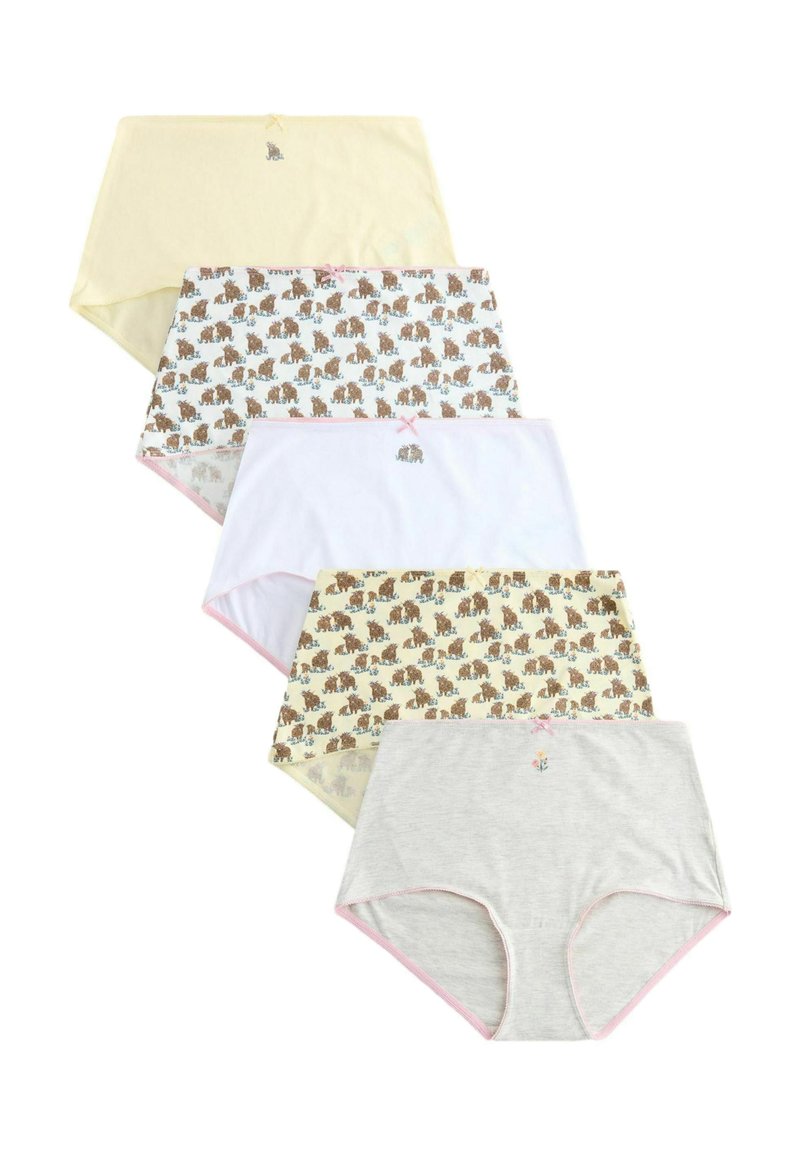 Öt pár női magas derekú fehérnemű sárga, fehér, szürke színekben, valamint kettő barna medve mintával, mindegyik kis hímzett részletekkel.