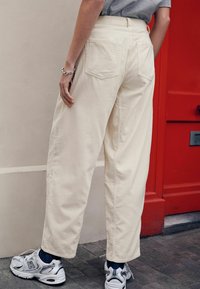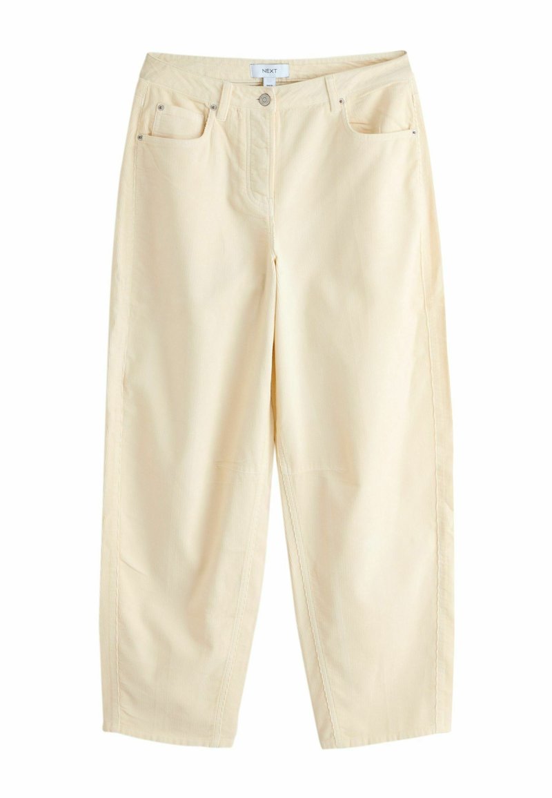 Krém színű, széles szárú pamut nadrág cipzáras és gombos záródással, elülső zsebekkel és finom textúrával.