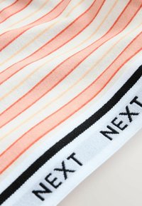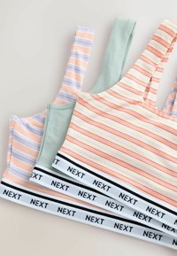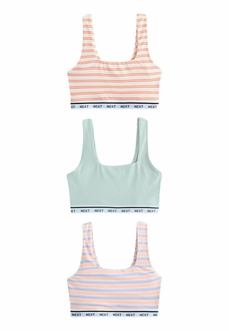 Három női crop top széles pántokkal és rugalmas NEXT márkájú szalaggal; kettő pasztell színű vízszintes csíkokkal, egy egyszínű világos zöld.