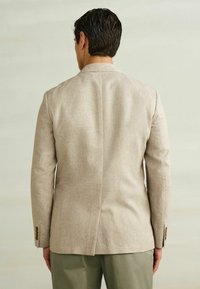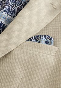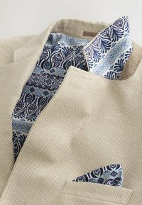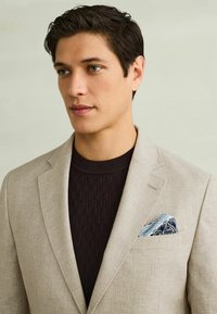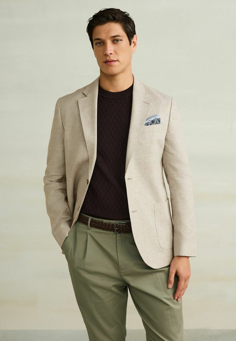 Férfi, bézs blézerben sötét pulóver fölött, világoszöld nadrágban, mintás zsebkendővel, egyszínű háttér előtt állva.
