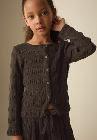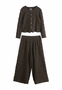 Fiatal lány áll, sötétbarnás, gombos, texturált kardigánt és hozzáillő, bőszárú nadrágot visel bézs bebújós cipővel, semleges háttér előtt.