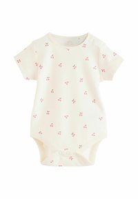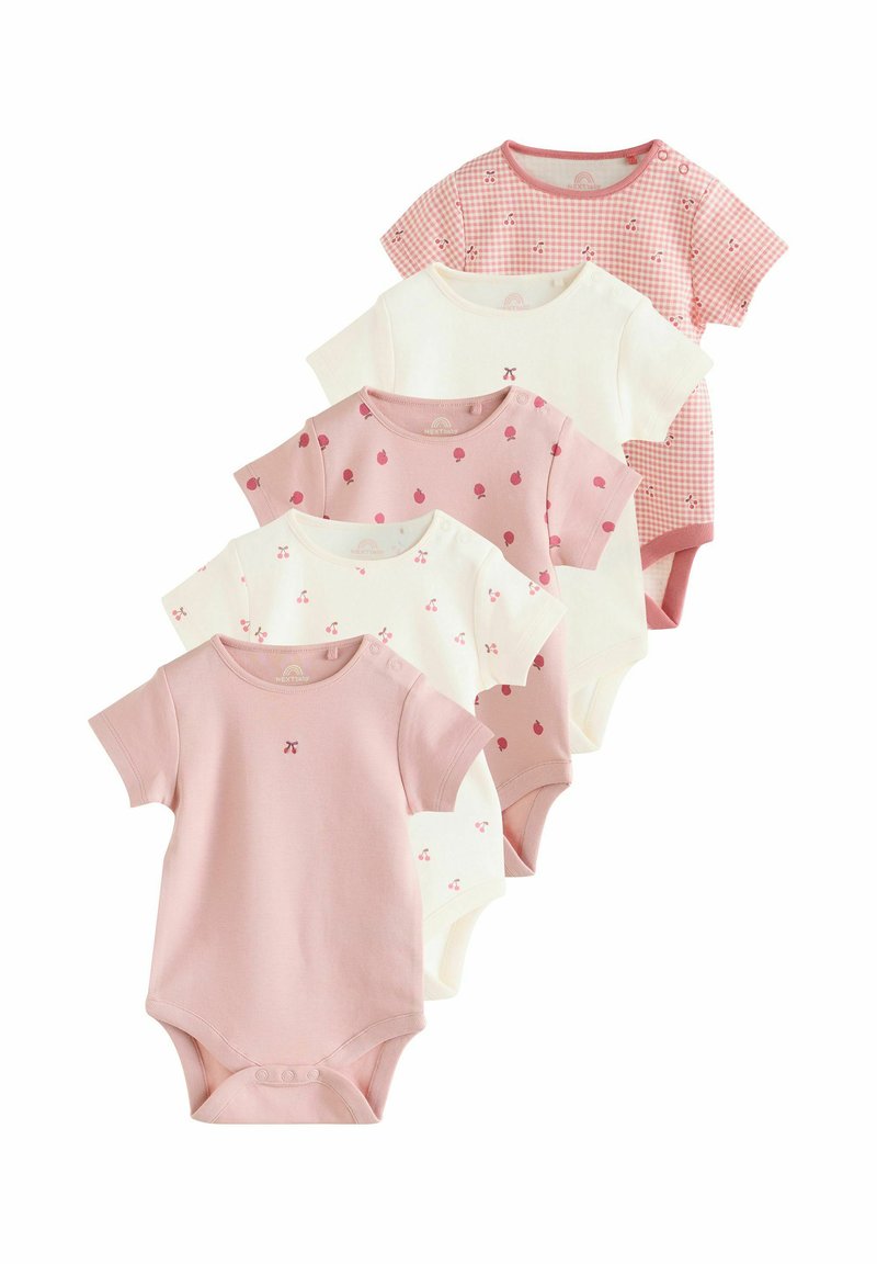 Öt rövid ujjú baba body rózsaszínben és fehérben, cseresznye és gyümölcs mintákkal, egymásra helyezve, eltolva, fehér háttéren.