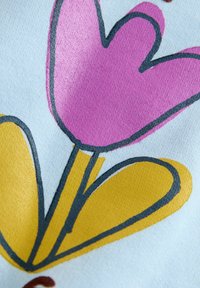 Világoskék pulóver, amelyen rózsaszín tulipán és sárga levelek grafikája látható, valamint barna színű, "HAPPY MOMENTS" felirat.