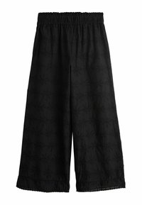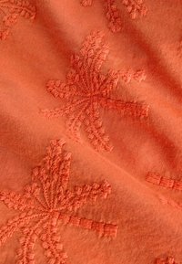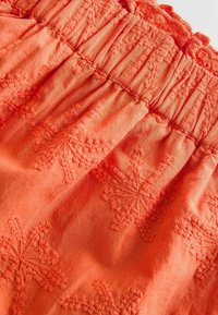 Narancssárga, bő szárú nadrág rugalmas derékrésszel, virágmintás textúrával, hullámos szegéllyel és könnyű anyagból.
