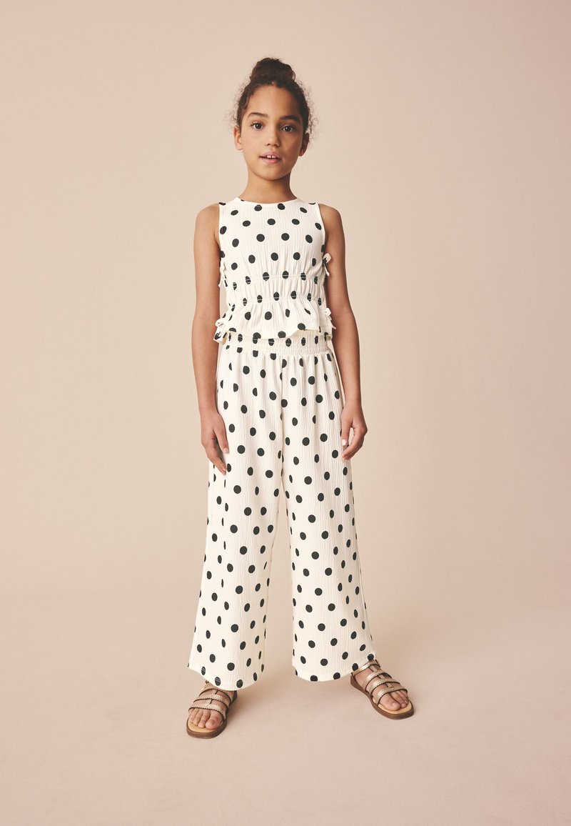 Fiatal lány áll, ujjatlan fehér felsőben és hozzáillő, fekete pöttyös bő szárú nadrágban, barna pántos szandált viselve.