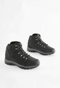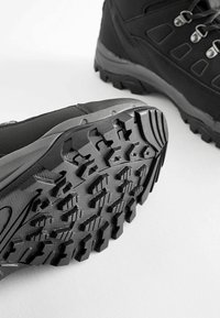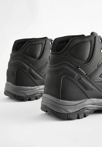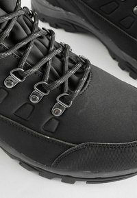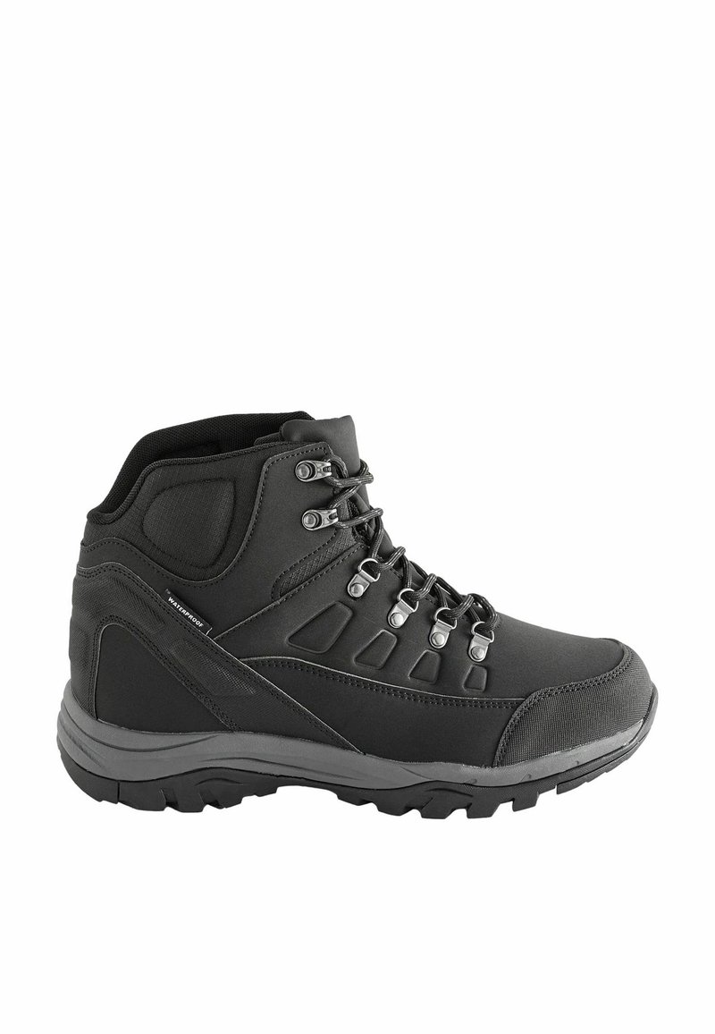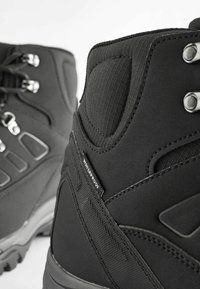 Fekete vízálló túracipő párnázott gallérral, fém fűzőlyukakkal és robusztus talppal a jobb tapadás és támogatás érdekében.