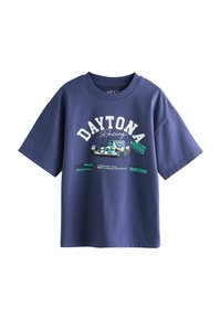 Három rövid ujjú, verseny témájú póló özönkék színben: türkiz, tengerészkék és bézs, mindegyiken versenyautó grafikák és szöveg található az elején.