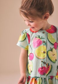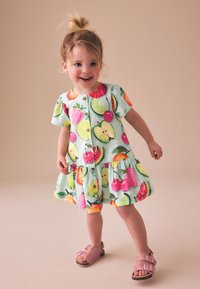 Gyermeklány mosolyogva áll, rövid ujjú ruha színes gyümölcsmintákkal és rózsaszín szandálok, semleges háttér előtt.