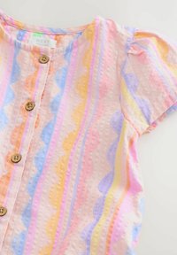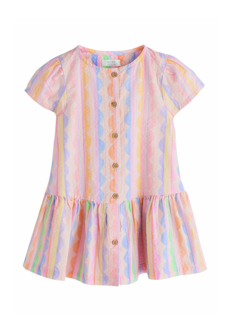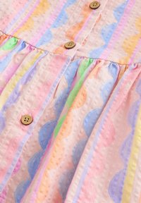 Rövid ujjú kisgyermek ruha többszínű, függőleges hullámos csíkokkal, elöl fa gombokkal és fodros, fodrozott szegéllyel.