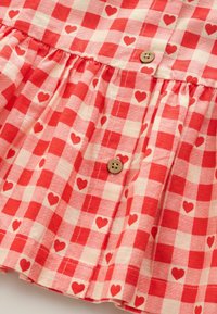 Piros és rózsaszín kockás, rövid ujjú ruha szívmintákkal, gombos elejű és fodros szoknyával. Könnyű anyagból készült.