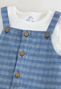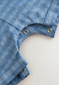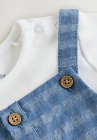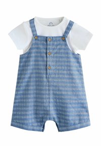 Farmerrövidnadrág fehér pólóval alatta, függőleges csíkokkal, négy fa gombbal és hímzett részletekkel.