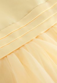 Sárga ruha ujjatlan kialakítással, szatén fűzőrésszel és réteges tüll szoknyával. A szoknya lágy, áttetsző textúrájú, lebegő sziluettel.