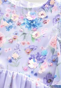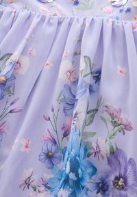 Levendula színű ruha rövid, fodros ujjakkal, kék, rózsaszín és lila virágmintával, flitterekkel díszítve az előkön és a szoknyán.