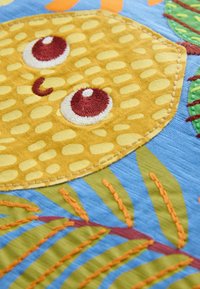 Kék rövid ujjú ing mosolygó citrom folttal, hozzá illő, több színű, függőleges csíkos, bordázott mintájú rövidnadrággal.