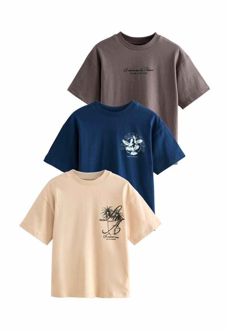 Három póló: barna, tengerészkék és bézs. Puha pamut, laza szabás, mindegyiken egyedi grafikák: bézsen szöveg és pálmafák láthatók.