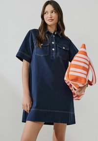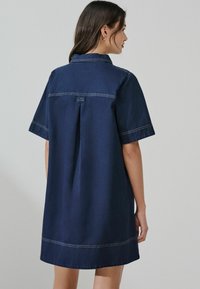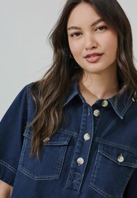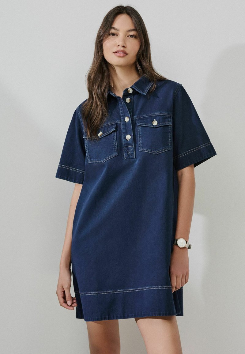Nő rövid ujjú sötétkék farmerruhában, elöl gombsoros, mellzsebekkel, a bal csuklóján karórával.