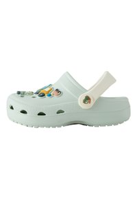 Világosbarna, könnyen felhúzható klumpa szellőzőlyukakkal, állítható sarokpánttal és díszítő medvearc mintával a lábujjrészen.