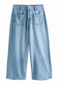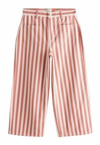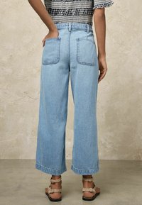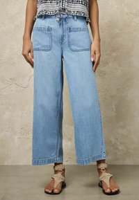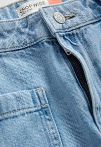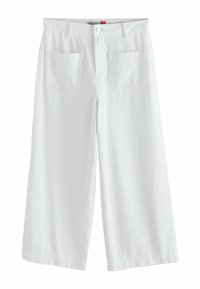 Kéz emel fel fekete-fehér kockás felsőt, amely halvány kék farmernadrág fölött van, nagy elülső zsebekkel, bézs fal előtt.