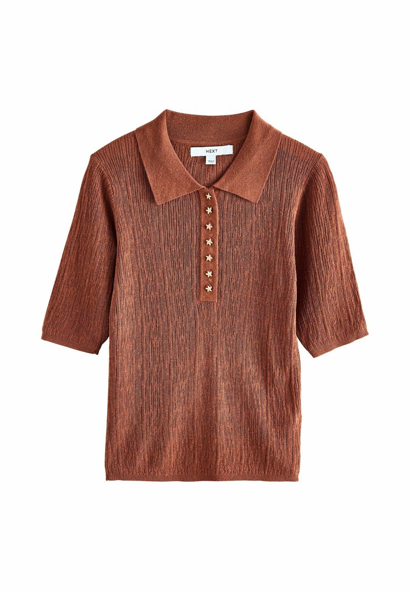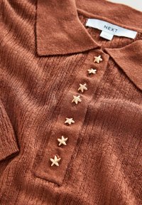 Rozsda-barna rövid ujjú kötött póló texturált anyagból, hegyes gallérral és hat díszes arany csillag alakú gombbal az elülső részen.