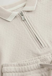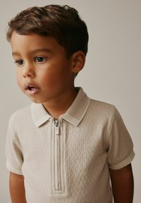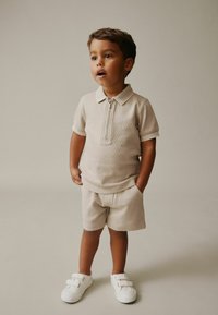 Bézs színű, félig cipzáros kötött galléros póló, hozzáillő rövidnadrággal, mindkettő texturált mintával. Fehér pántos tornacipő egészíti ki az összeállítást.