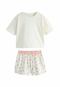 Három garnitúra rövid ujjú ing és hozzáillő, elasztikus derékpántos rövidnadrág rózsaszín, fehér és mintás pasztell színekben.