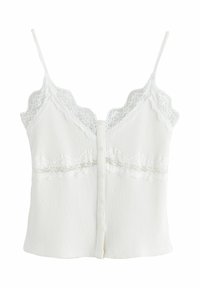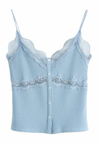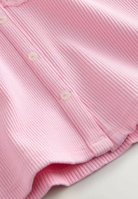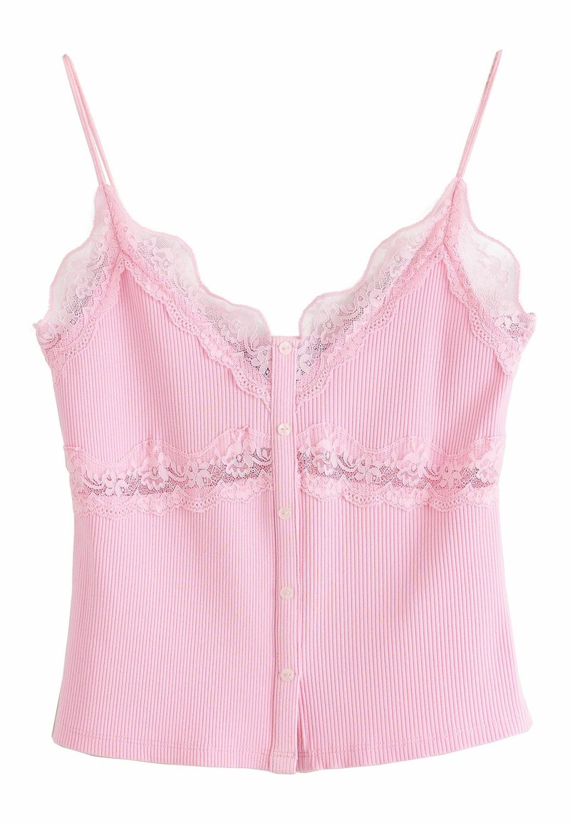 Rózsaszín bordázott trikó vékony pántokkal, elülső gombokkal és csipkebetéttel a nyakkivágás és a középső rész mentén.