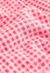 Rózsaszín és piros kockás rövidnadrág elasztikus derékpánttal és oldalzsebekkel, fehér háttér előtt bemutatva.