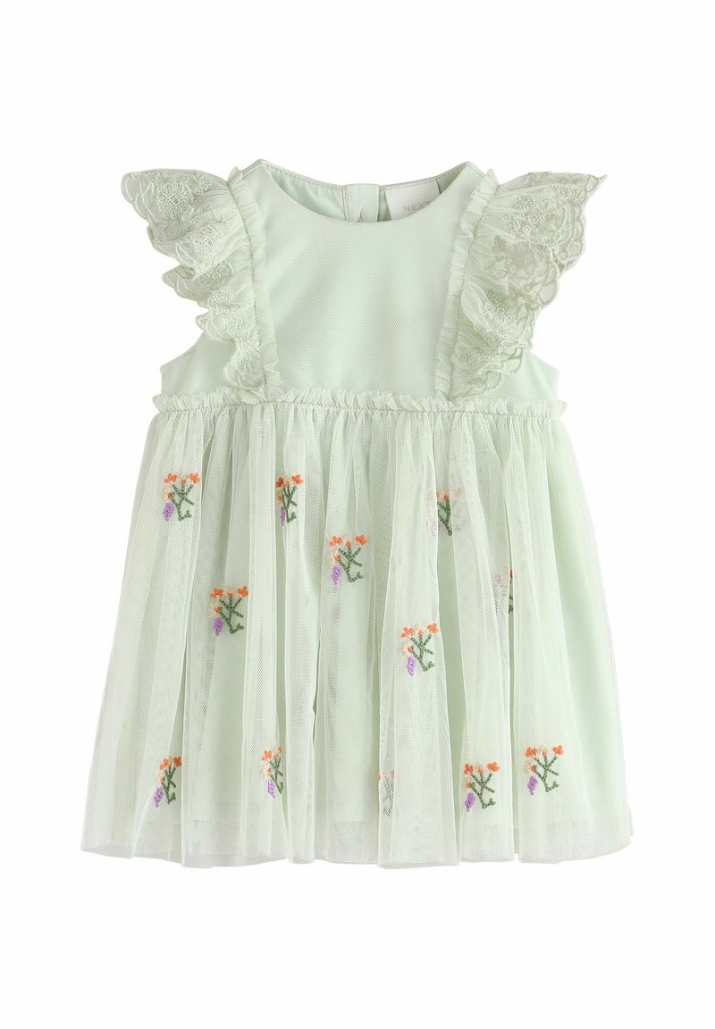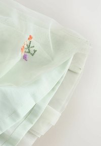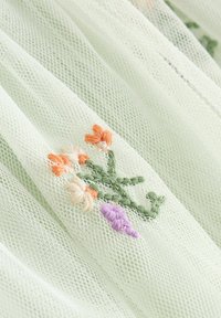 Világoszöld ruha csipkés fodros ujjakkal, réteges áttetsző borítással és narancs-lila virágos hímzéssel az alján.