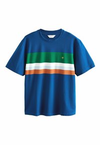 Rövid ujjú póló, amely fehér felső résszel, texturált világoskék középső résszel és sötétkék alsó résszel rendelkezik.