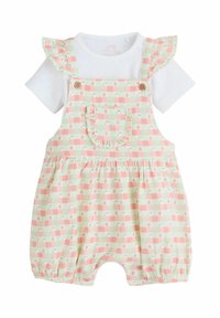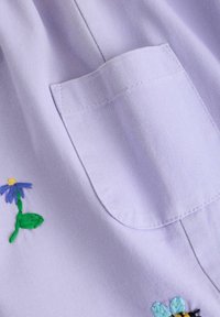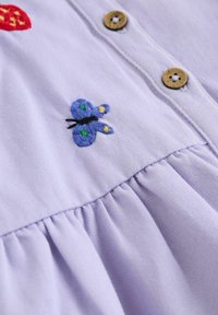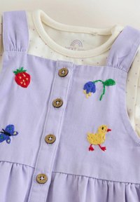 Levendulalila napozó gombokkal, hímzett eperrel, virágokkal, állatokkal, krémszínű pöttyös rövid ujjú ing fölött viselve.