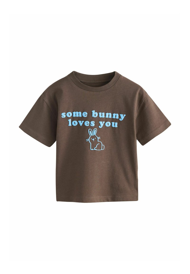 Barna rövid ujjú póló világoskék felirattal: "valaki szeret téged", és a felirat alatt egy egyszerű kék nyuszi ábrázolás.