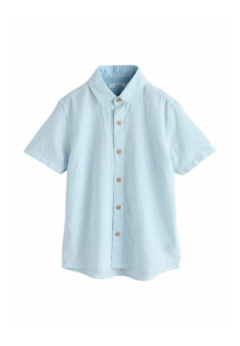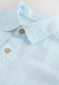 Világoskék rövid ujjú, gombos ing klasszikus gallérral és öt látható barna gombbal az elülső részen.