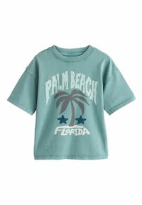 Három rövid ujjú, kerek nyakú póló: egy bézs színű, absztrakt mintával; egy sötétrózsaszín, pálmafával és nappal; valamint egy türkizkék "Palm Beach Florida" felirattal.