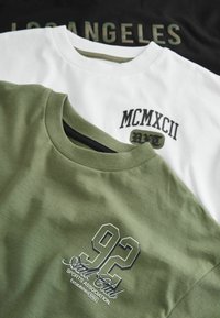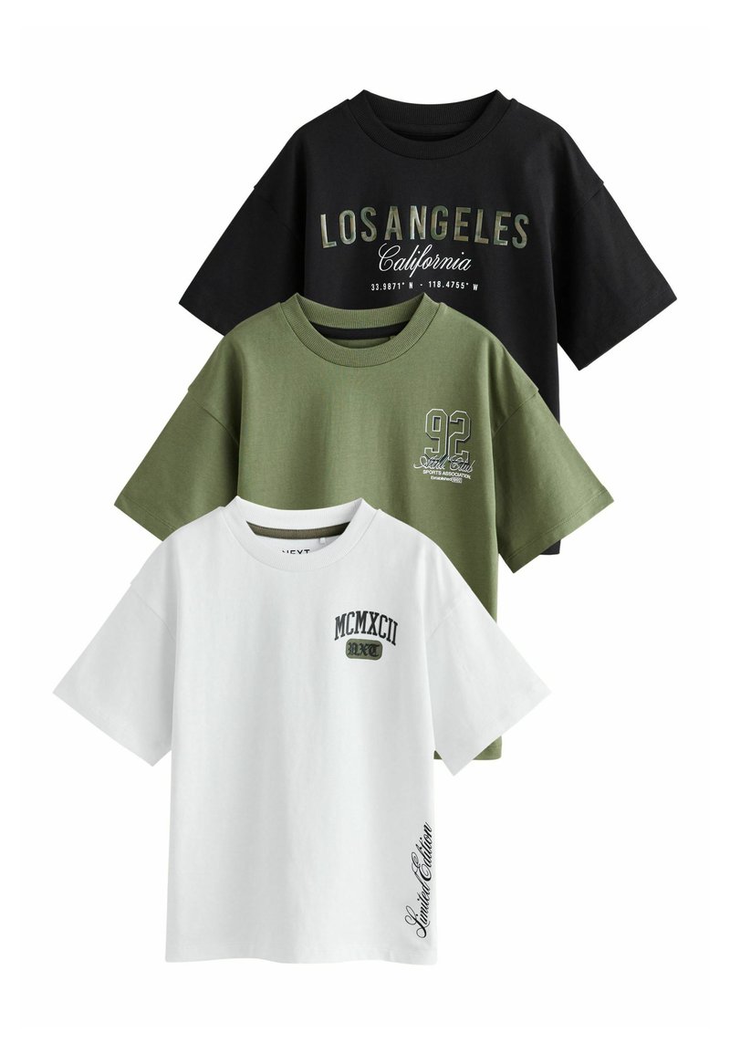 Három rövid ujjú póló: fekete "LOS ANGELES" felirattal, olivazöld a "92" számmal, és fehér "MCMXCII" részlettel. Pamut anyagból.