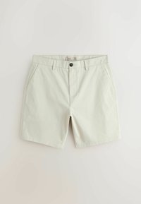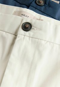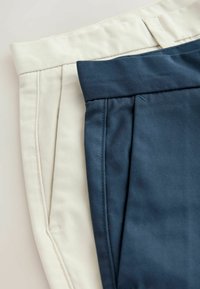 Két pár férfi chino rövidnadrág tengerészkék és bézs színekben, elülső zsebekkel, övhurkokkal és gombos rögzítéssel.