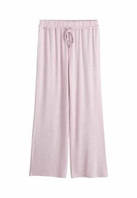 Világos rózsaszín otthoni viselet szett rövid ujjú, crop felsővel, kötőelemekkel és széles szárú nadrággal, rugalmas derékpánttal. Puha textúra.