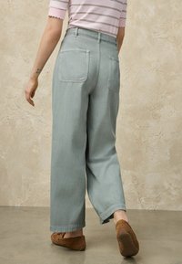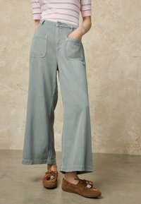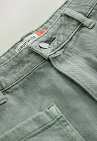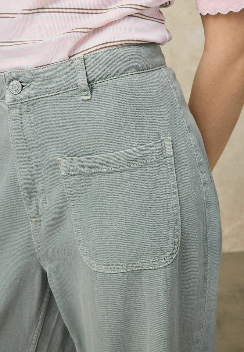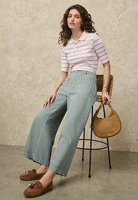 Közeli kép egy személyről, aki világoszöld farmernadrágot visel, amelyen nagy első zseb található, és rózsaszín csíkos felsőt.