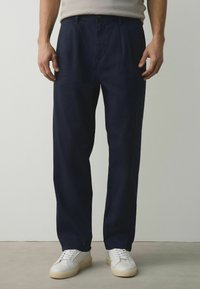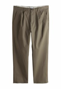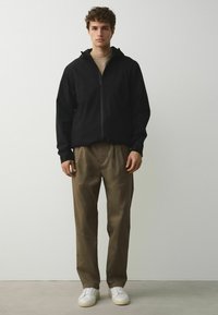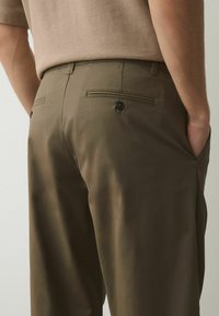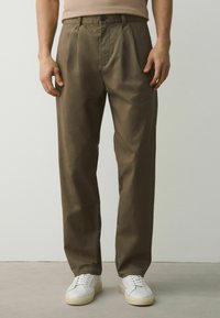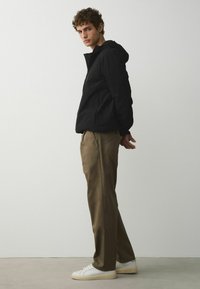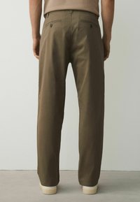 Férfi olívazöld egyenes szárú nadrágban és fehér sportcipőben, egy sima, világos fal előtt áll.