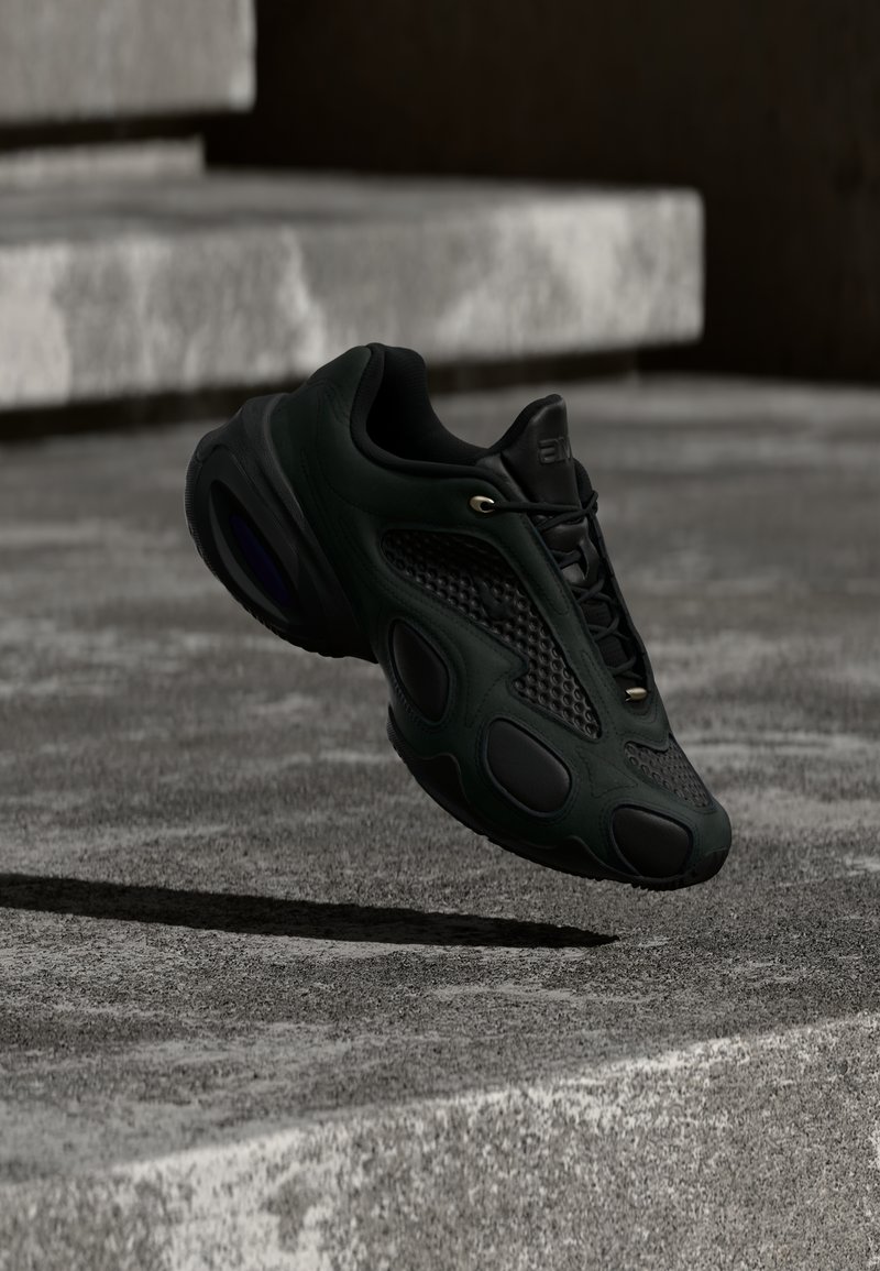 Fekete atlétikai sportcipő texturált panelekkel és fűzőkkel, alacsony fényben, betonfelület és lépcsők felett lebegve.