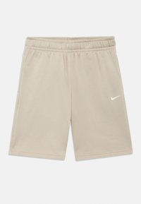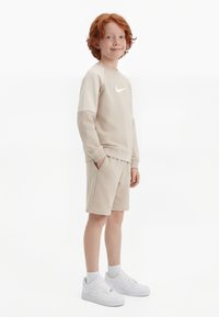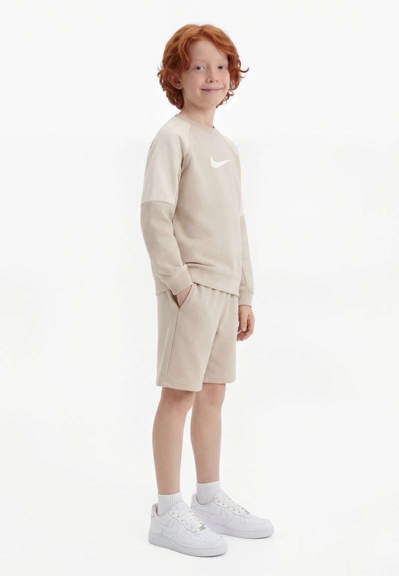 Vörös hajú gyermek áll, bézs Nike pulóvert és rövidnadrágot visel, fehér zoknival és fehér Nike sportcipővel, egyszínű fehér háttér előtt.