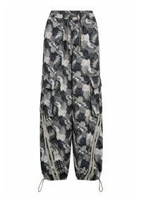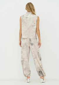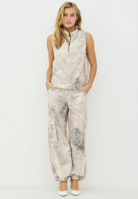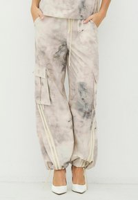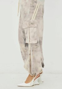 Könnyű, bézs színű batikolt cargo nadrág szürke részletekkel. Oldalzsebekkel, rugalmas mandzsettákkal és függőleges krémszínű csíkokkal az oldalán.