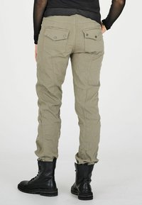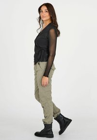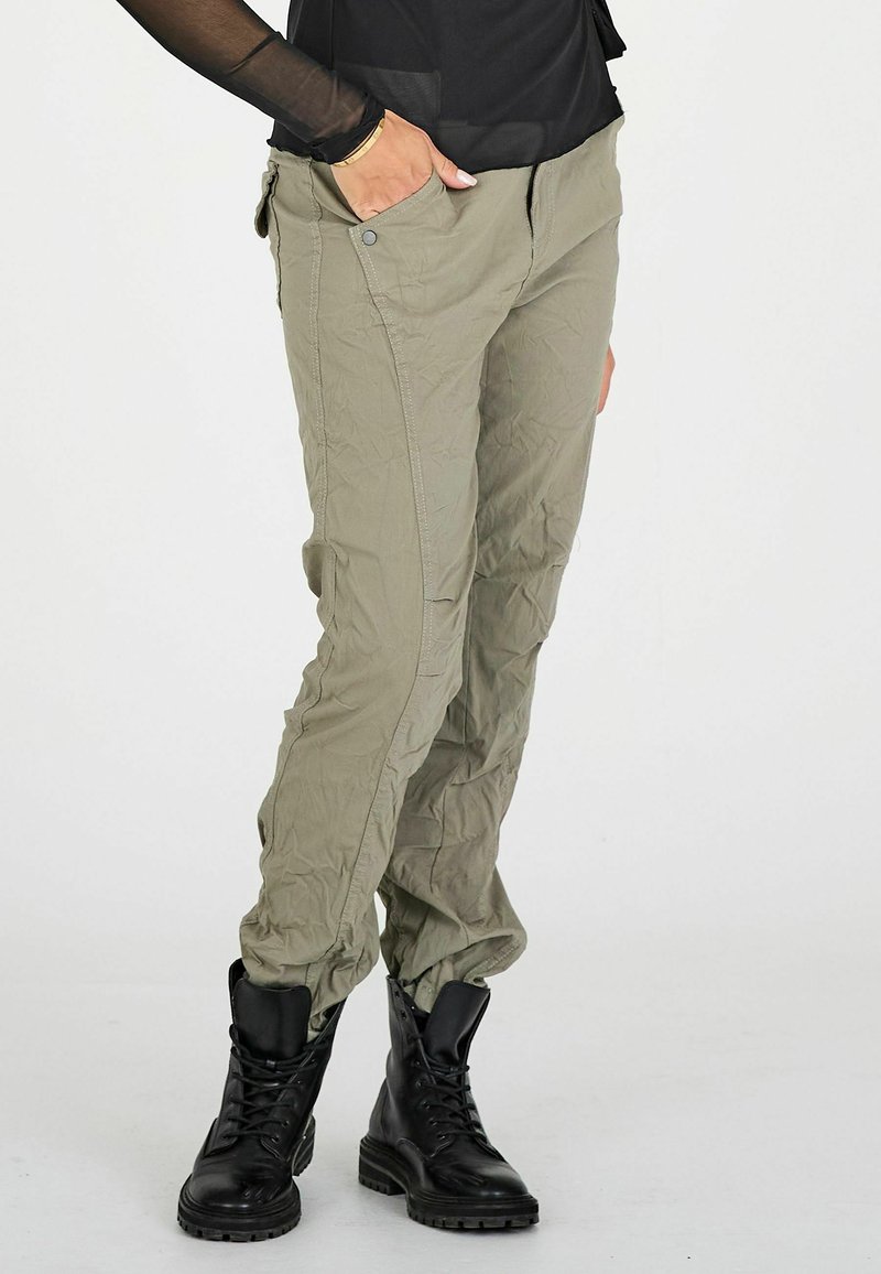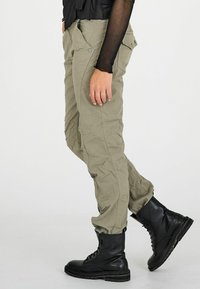 Világos khaki cargo nadrág, texturált felülettel, oldalzsebekkel és slim fit szabással, fekete fűzős katonai bakancsokkal párosítva.